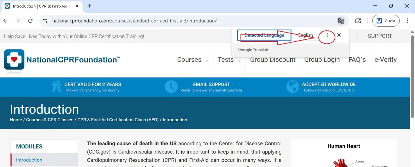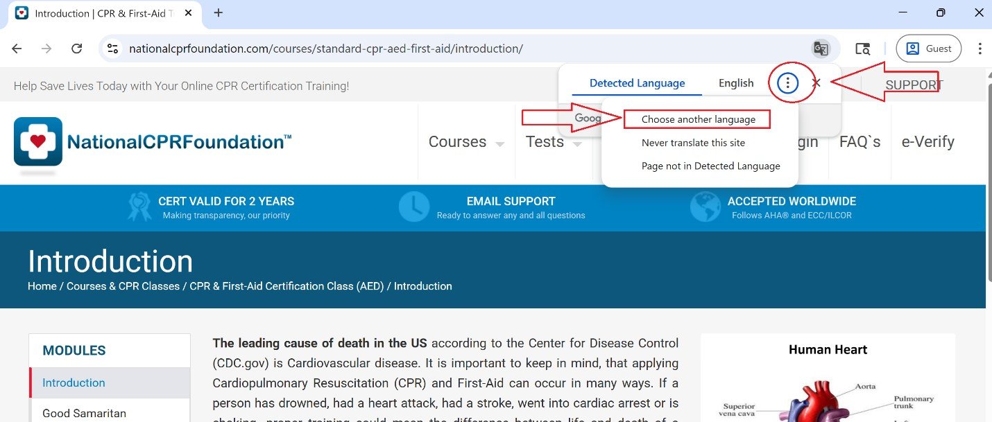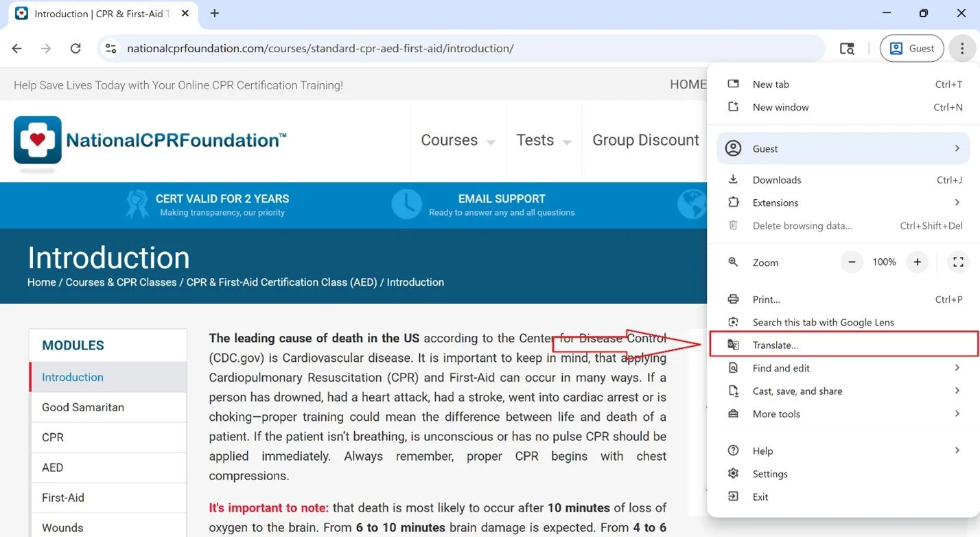 To navigate this website or the CPR training in languages other than English, we recommend Google Chrome Browser with its built-in translation function